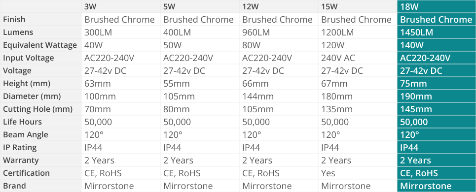 That’s what the Mirrorstone 18W Fitted LED Frosted Downlight is. It includes everything you need – bulbs and a driver, and it’s massively more efficient than an equivalent halogen light.